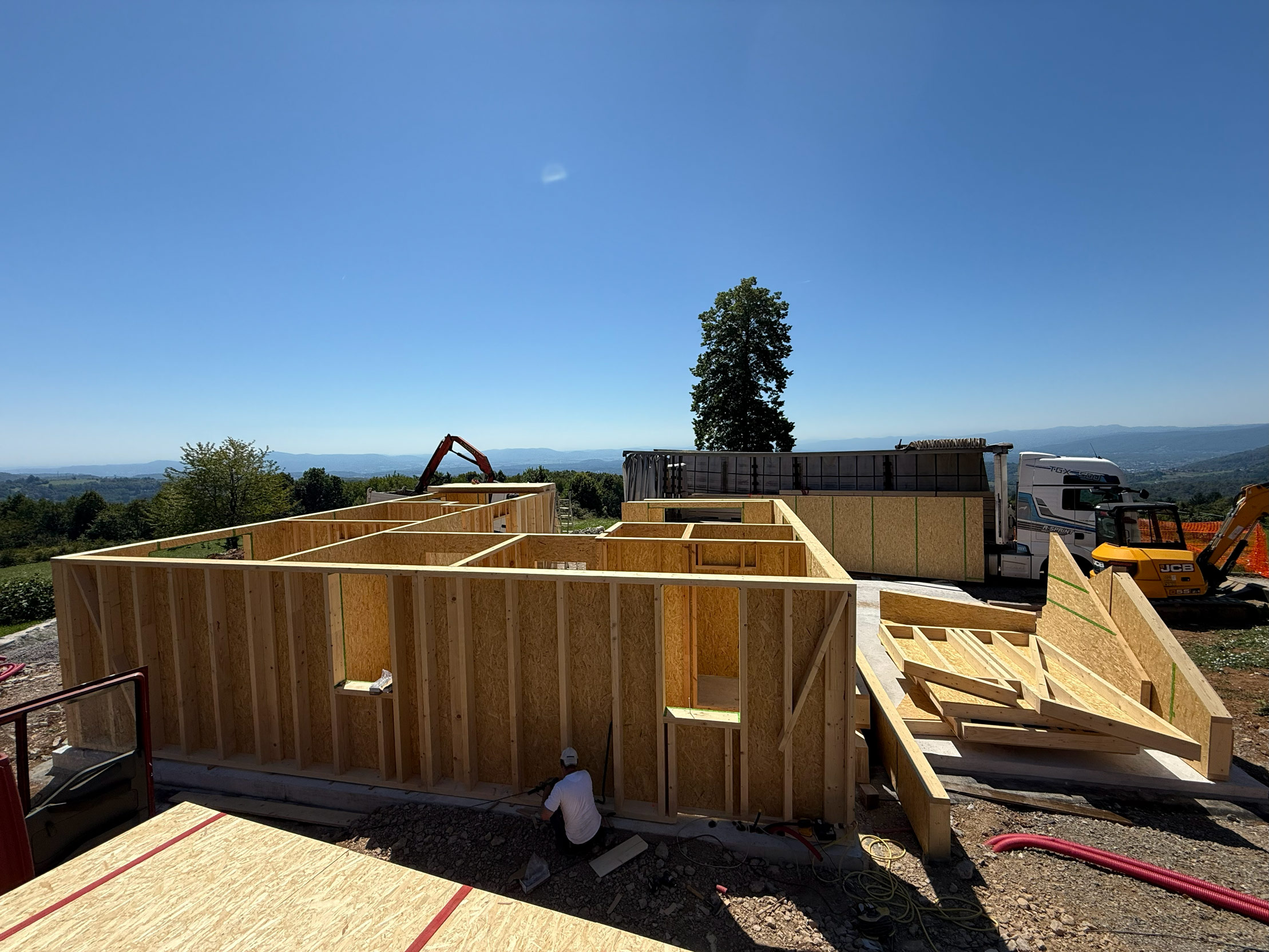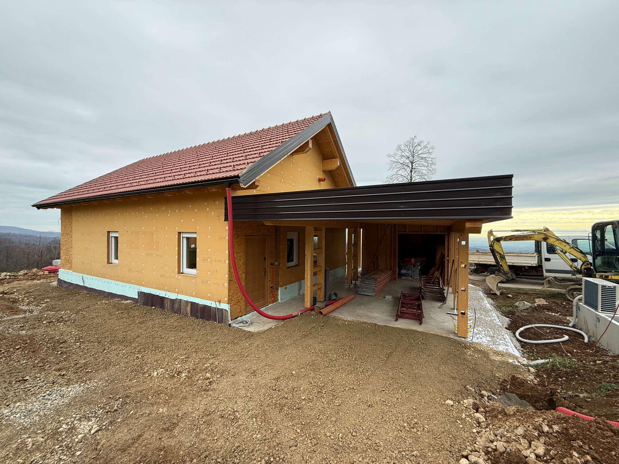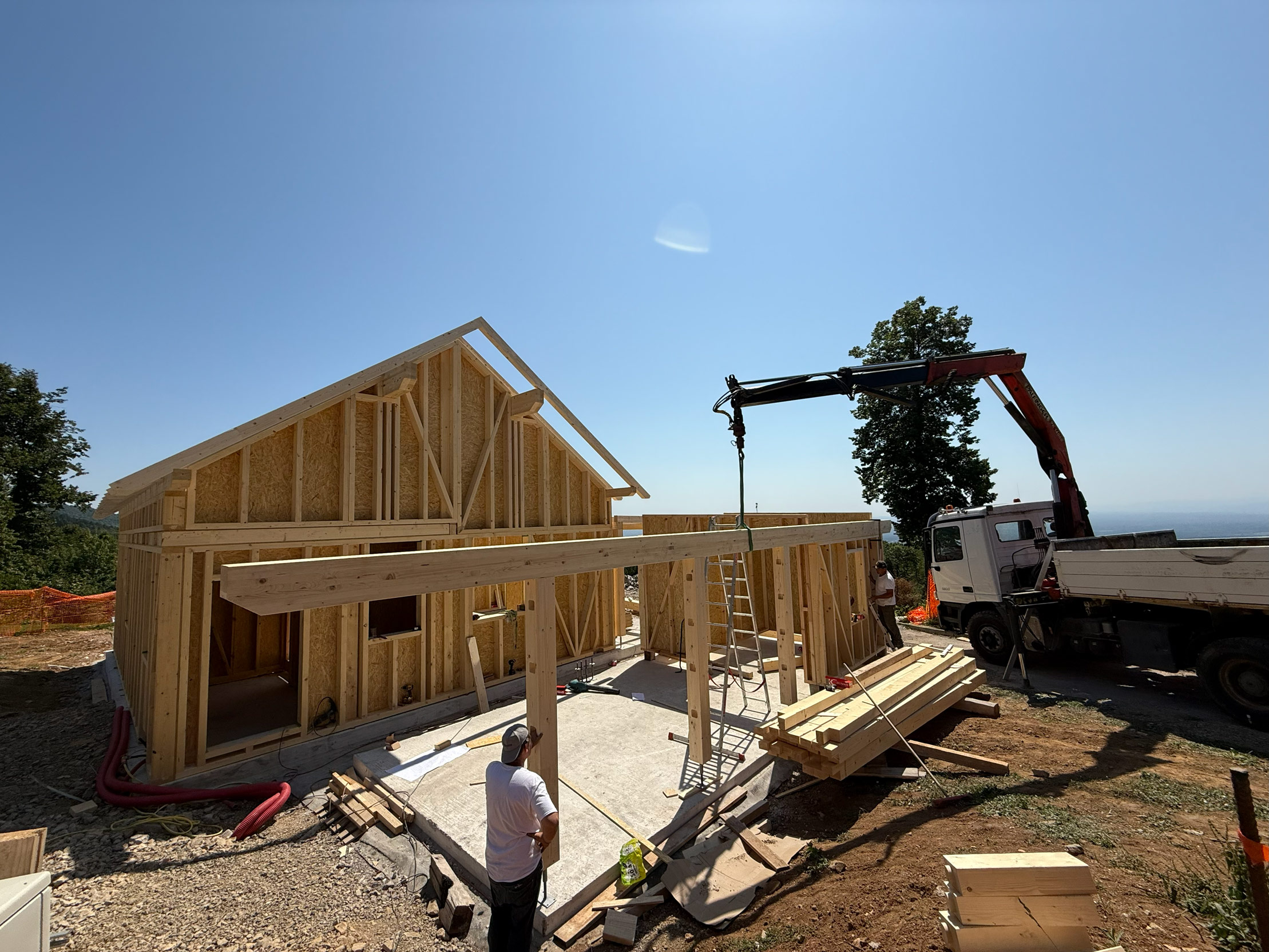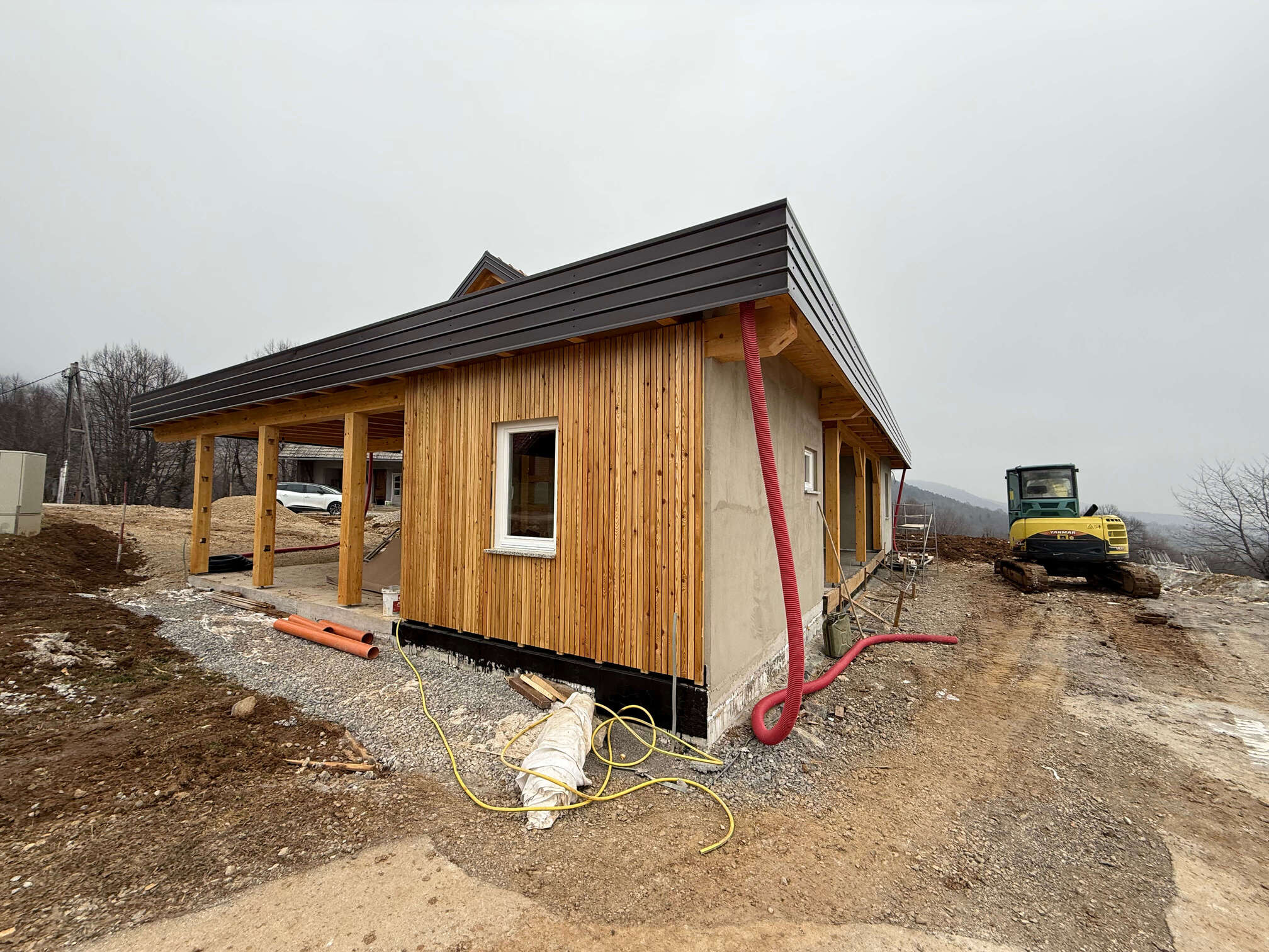 Gre za hišo z dvokapno streho. Hiša ima pritličje z uporabno površino približno 80 m² in vključuje dnevni prostor, dve spalnici, kopalnico, kuhinjo, shrambe in tehnični prostor. Objekt je lesene montažne konstrukcije s toplotno izolacijo iz vpihanih lesenih vlaken, podprto z vlaknenimi lesenimi ploščami na notranji in zunanji strani. Temelji na betonski plošči, kritina je iz glinenih strešnikov. Pridruženi sta garaža in drvarnica. Nadstrešnice (terase) imajo skupno površino približno 25 m². Hiša je opremljena s toplotno črpalko za ogrevanje, talnim ogrevanjem, lastno čistilno napravo.
