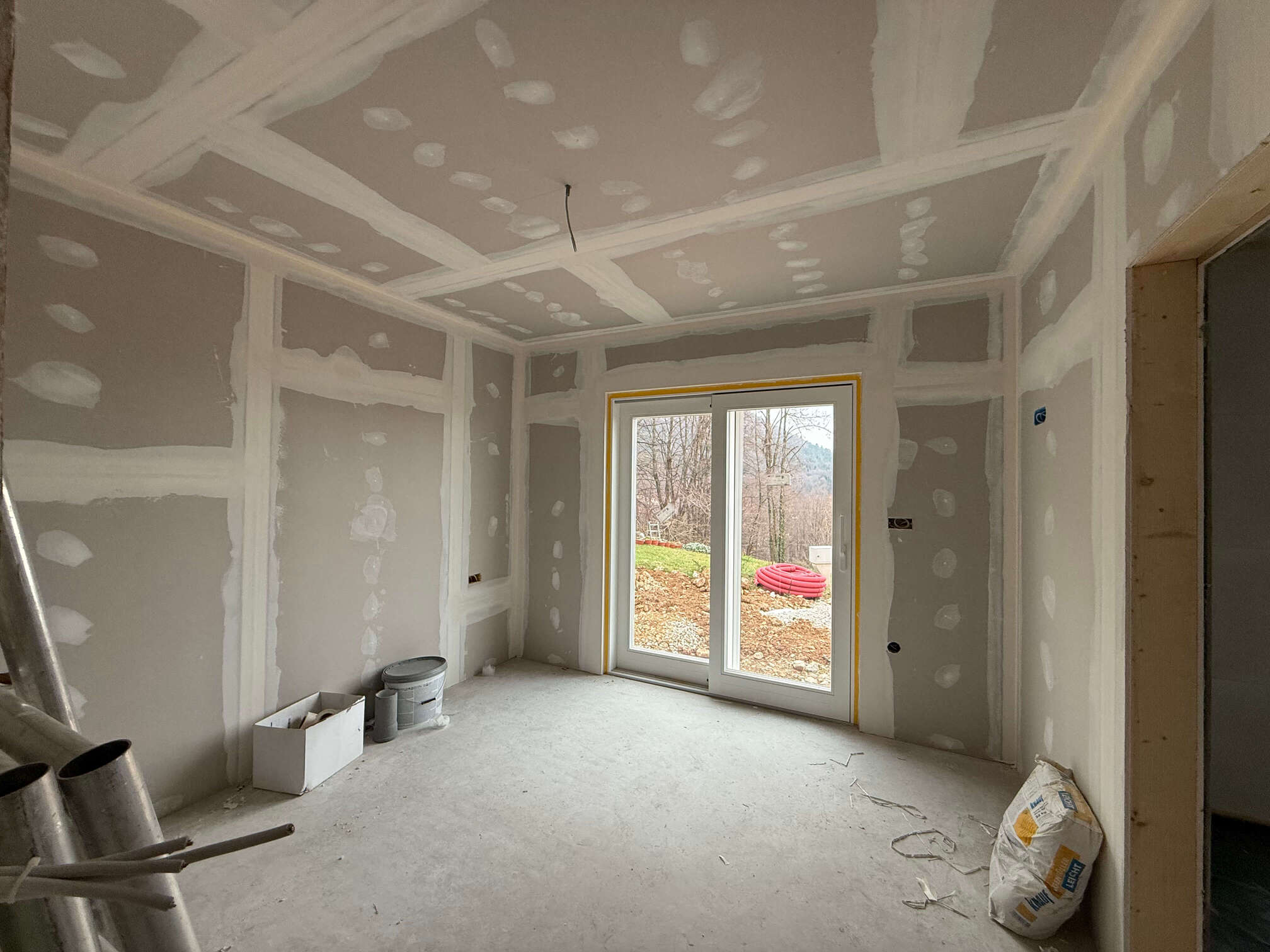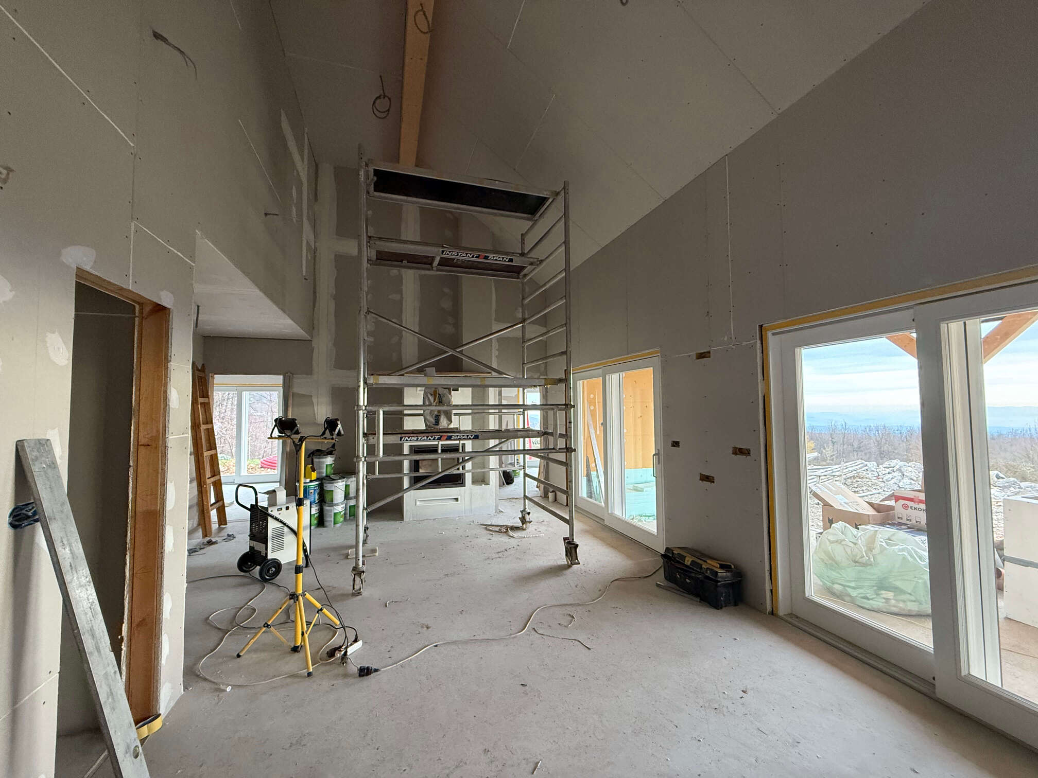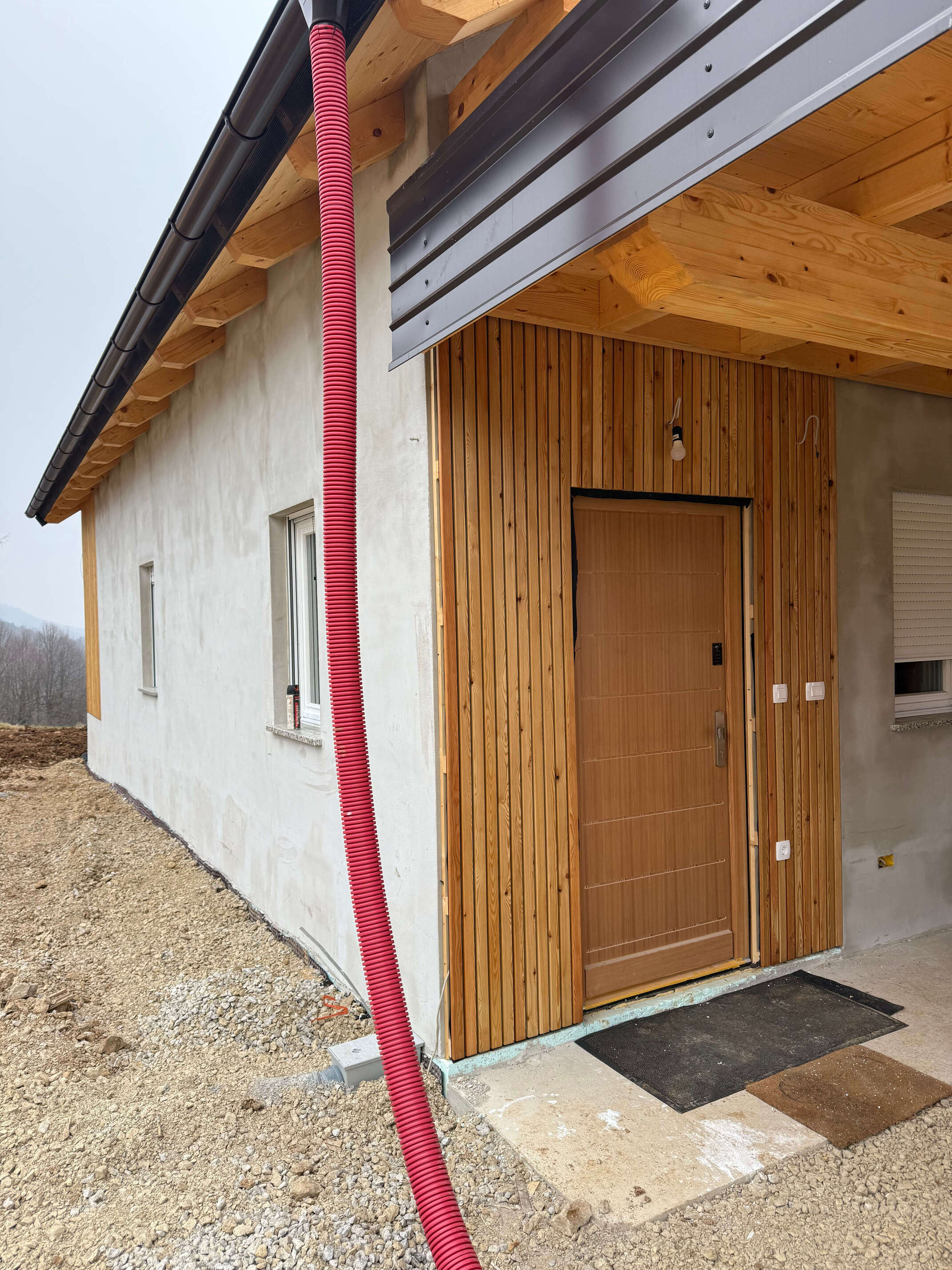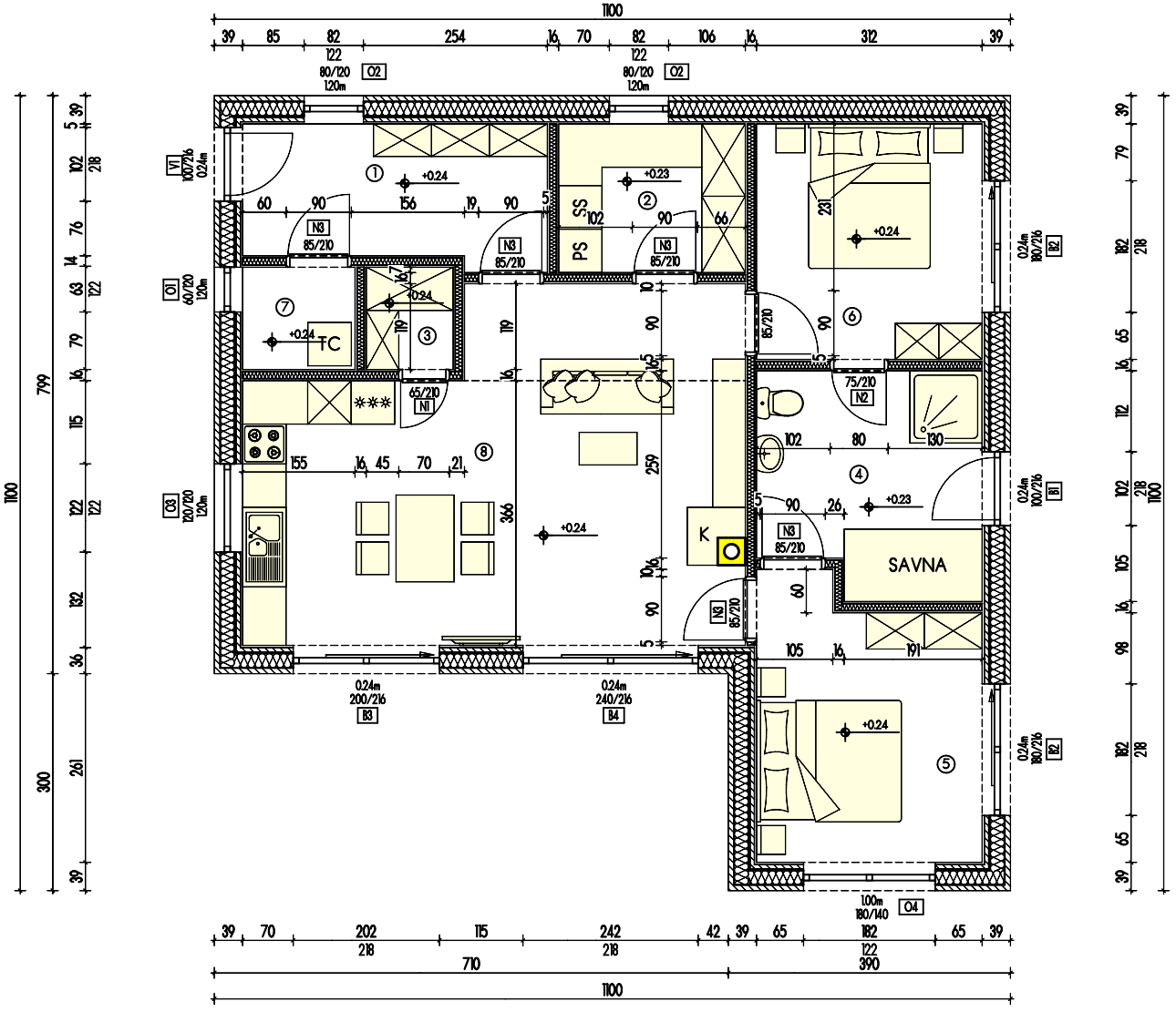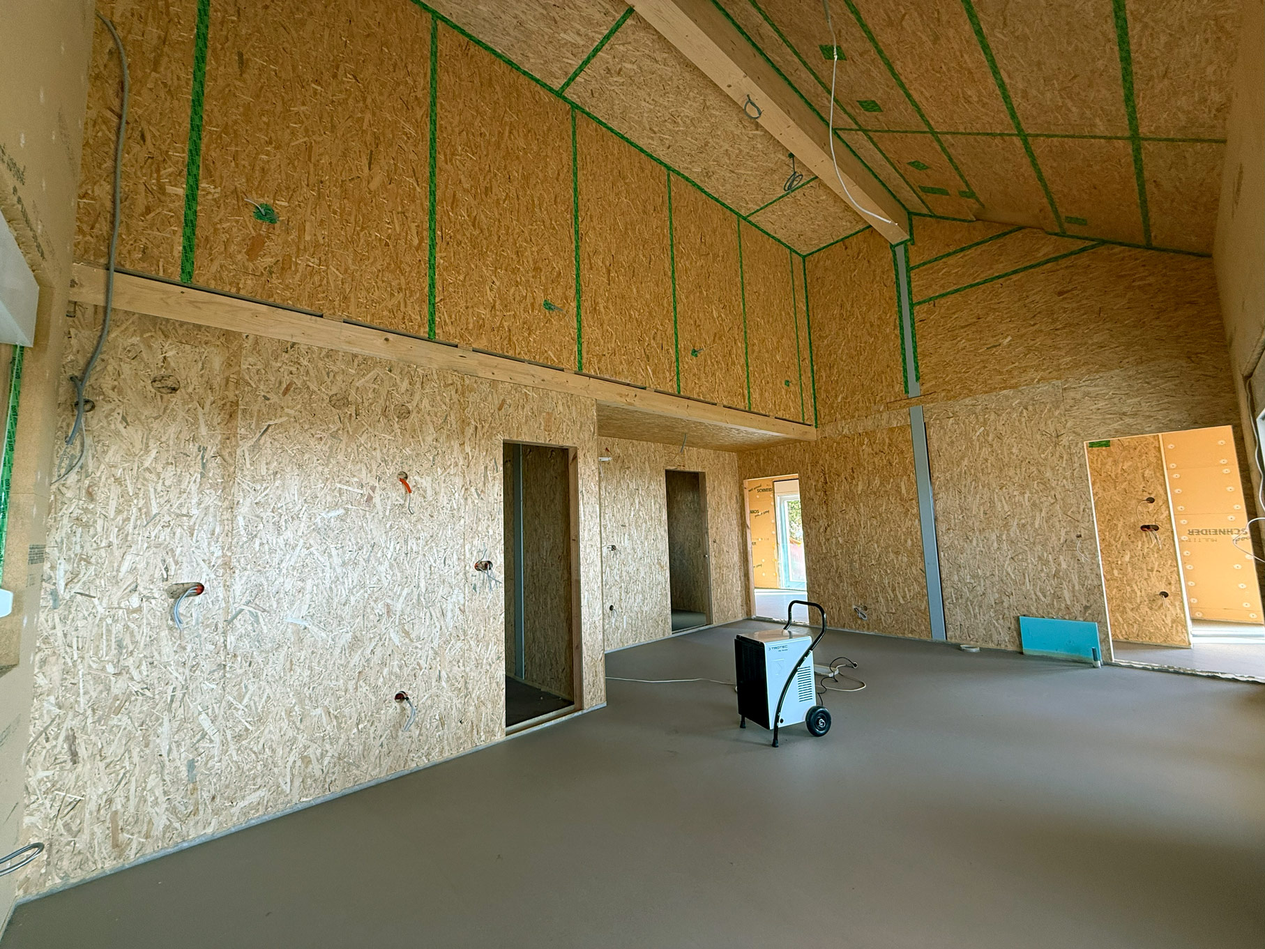 Gre za hišo z dvokapno streho. Hiša ima pritličje z uporabno površino približno 80 m² in vključuje dnevni prostor, dve spalnici, kopalnico, kuhinjo, shrambe in tehnični prostor. Objekt je lesene montažne konstrukcije s toplotno izolacijo iz vpihanih lesenih vlaken, podprto z vlaknenimi lesenimi ploščami na notranji in zunanji strani. Temelji na betonski plošči, kritina je iz glinenih strešnikov. Pridruženi sta garaža in drvarnica. Nadstrešnice (terase) imajo skupno površino približno 25 m². Hiša je opremljena s toplotno črpalko za ogrevanje, talnim ogrevanjem, lastno čistilno napravo.